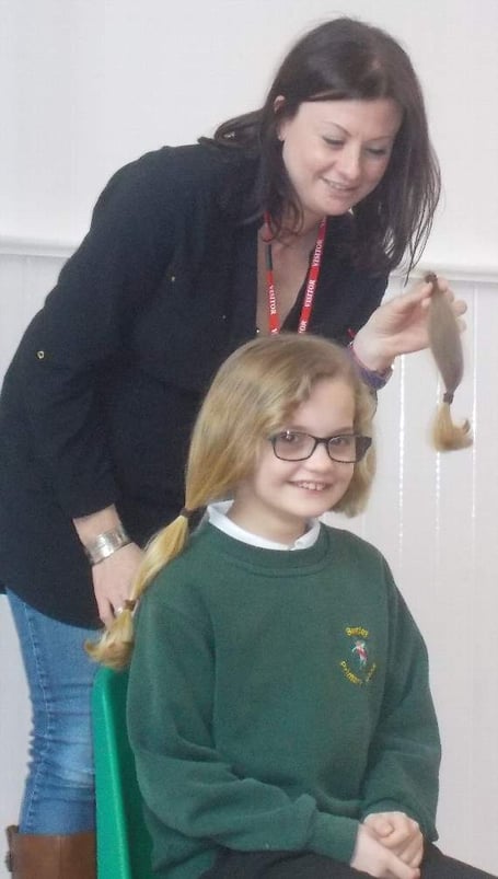 Maddison was accompanied by her mum, Natalie, and family friend Becky Beevor, a professional hairdresser, did the haircut which, when the last lock had been collected, was greeted by loud applause from pupils and staff.