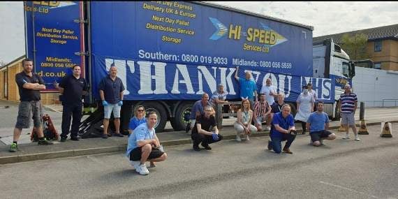 Ian then sent a lorry from his courier firm to pick up most of the goodies on Saturday, collecting the rest on Easter Sunday – but not before adorning their lorry with a ‘Thank you NHS’ banner borrowed from Aldershot Town FC, via another family friend.