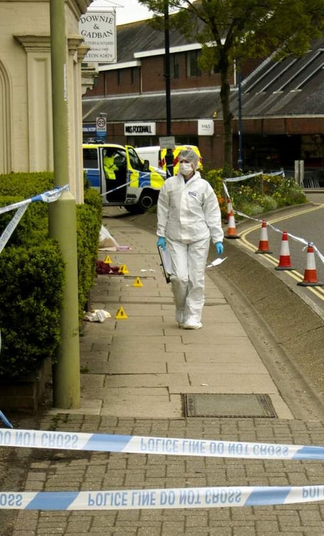 The pavement between The White Horse pub and Mann’s Chinese takeaway on Butts Road was cordoned off as police forensics officers scoured the area for evidence.