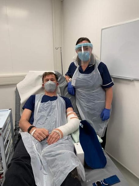 Also sharing an image from the hospital revealing his arm in a plaster cast, he added: "Happy Hunt children will now get busy drawing pictures..."